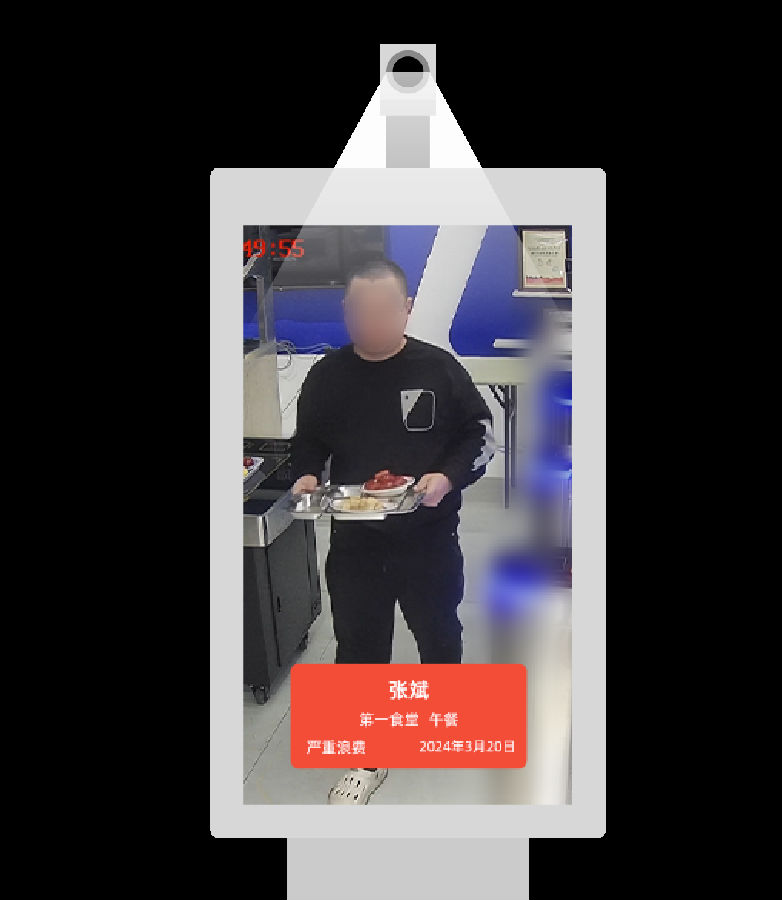 1、智能餐余监控一体机:就餐用户回收餐余时在设备处识别,精准读取用户信息、所剩餐余图片并显示浪费情况,提醒就餐人员。