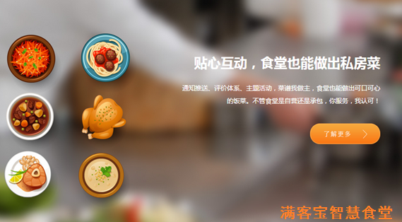 满客宝的手机APP或者融入微信、在线支付等互联网元素。彻底颠覆人员只有到食堂才知道吃什么饭的被动消费模式,学生也能像外卖订餐一样订食堂的饭。