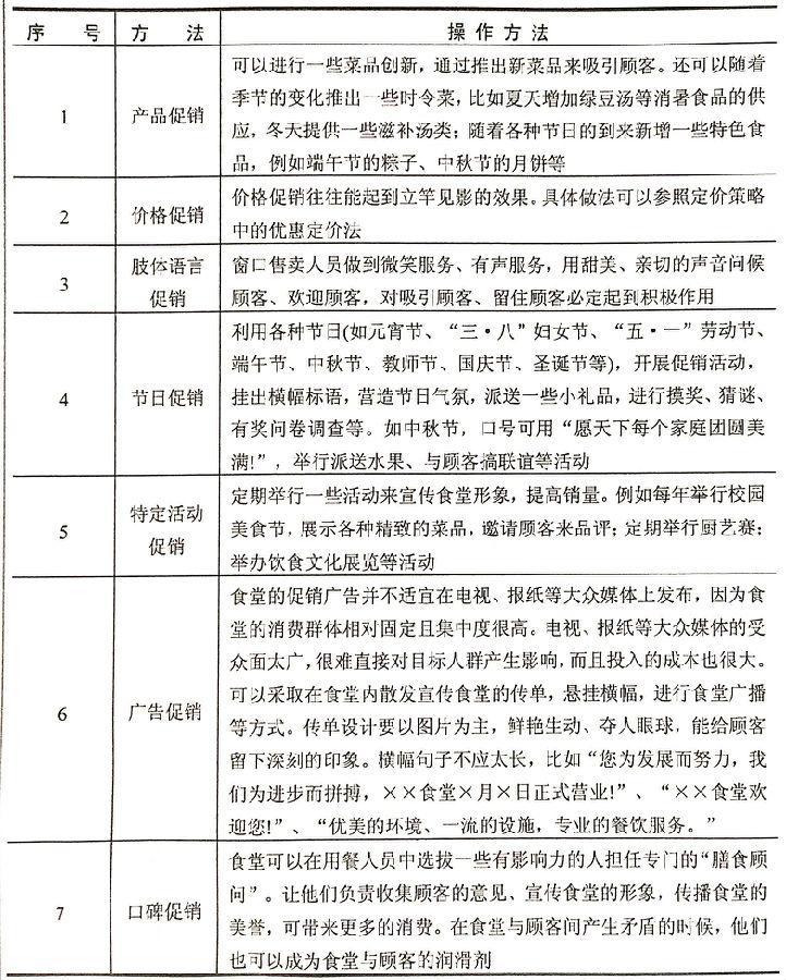 营业过程中的促销有如下下几种,其方法见表2-8.