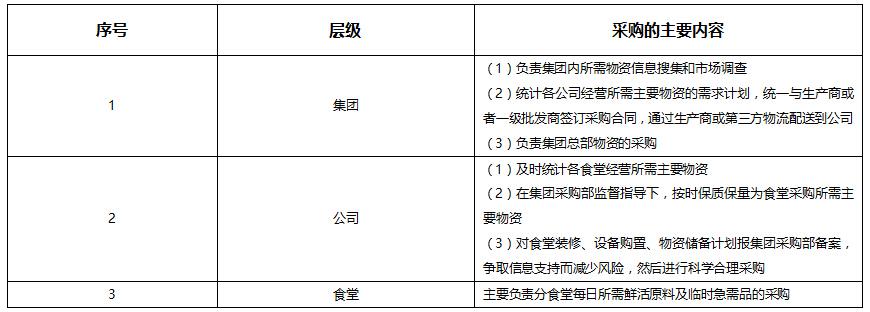 司、食堂的三理体系,那么,采购与供应管理就自然而然地要分集团、公司、食堂三个层级的对应内容,各层级的具体采购和供应内容见下表。