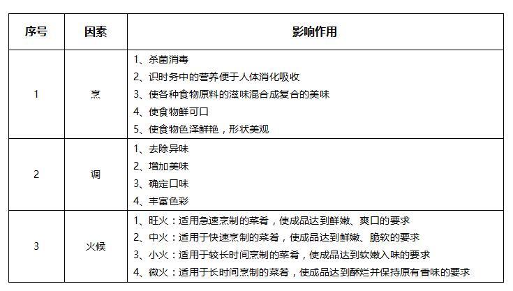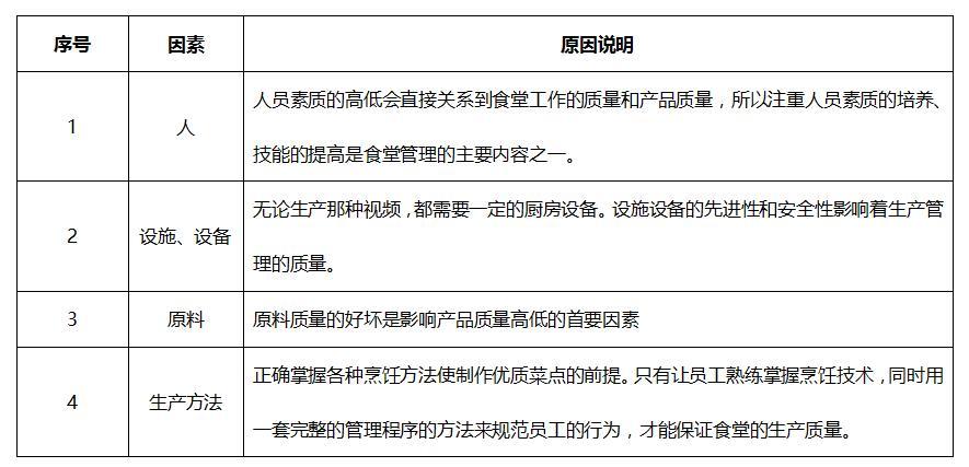 影响食堂生产质量的因素有人、设施设备、原料、生产方法等,见表。