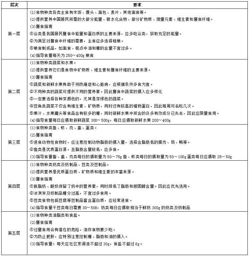 编制食谱,首先要了解膳食配餐的要求。中国居民平衡膳食标准是根据《中国居民膳食指南》而设计的,用于指导一般大众饮食,达到健康目的。膳食配餐包括以下几个层次(自下而上),见表