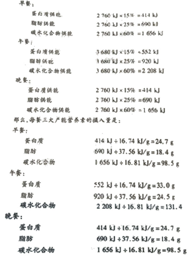 (3)确定用餐者每餐三大产能营养素摄取量。当确定了用餐者每餐能量需要量后,就可以根据三大产能营养素功能分配比计算出三大产能营养素的供能量。再根据三大产能营养素的产能系数,计算出每餐蛋白质、脂肪、碳水化合物的需要量。