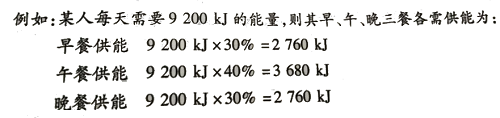 (2)确定用餐者每餐能量需要量。当确定了用餐者全天的能量需要量后,就可以根据三餐的能量分配比例计算出每餐的能量需要量。一般三餐的适宜分配比例为:早餐占30%,午餐占40%,晚餐占30%,可将全天的能量需要按此比例进行分配。