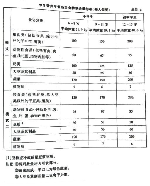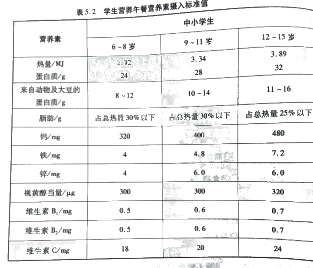 1998年,我过颁布了《中华人民共和国卫生行业标准—学生营养午餐营养供给量》的行业标准。此标准中规定:学生营养午餐就是在上学日,由学校食堂或饮食供应中心等为在校学生提供的符合营养要求的午餐。以一周五天为单位的日平均食物摄入量,午餐各类营养素的摄入量应占《推荐的每日膳食营养素供给量标准》的40%。