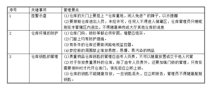 食堂的财产安全主要体现在防盗方面,食堂的防盗主要是抓好食品仓库的管理,具体如下表。
