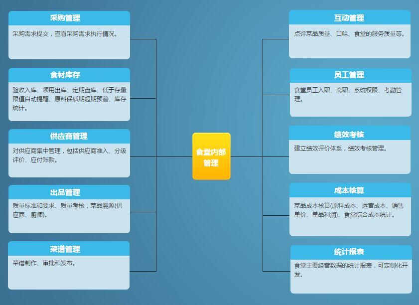 高校智慧食堂管理软件采取规范化、流程化、精细化、标准化管理,从预订备餐管理到出品管理到成本核算到采购管理到供应商管控到库存管理等形成一个闭环的管理流程,牵一发而动全身,各部门之间形成了有效的业务上下游部门或者岗位之间的监督制约机制。所有信息实时被管理者掌控,有效地解决采购部门个人利益大于企业利益。