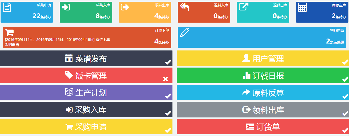 现代化食堂管理系统支持根据职工订餐数据进行原料反算,根据反算结果结合实时库存情况,直接生成出库申请或采购申请,无需人工计算。根据原料需求制作生产计划,生产计划包括订餐数量,计划生产量、制作厨师等信息。系统后台可以设定菜品生产系数,针对热卖菜品或低销量菜品可设置不同的生产系数,做到精准备餐。