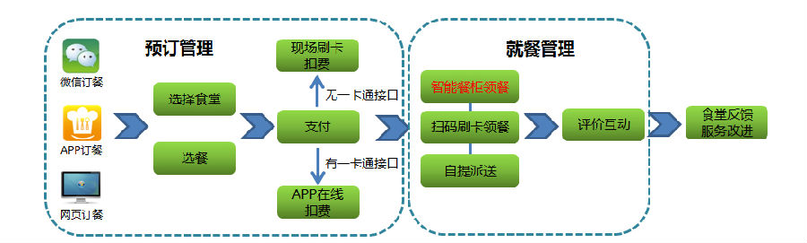 高校食堂管理系统实现网上预订餐,为学生提供APP、微信、触摸屏订餐机、网页等多终端订餐方式,方便学生随时随地进行报餐,省去排队选餐时间,极大地缓解了就餐高峰客流压力,学生选择自己所喜欢的饭菜进行订餐,可以选择自提或者派送,彩色多还可以如外卖一样,在宿舍坐等美味。学生还可以不用排队,选择智能取餐柜取餐方式,食堂将备好餐后把餐品放入智能取餐柜,餐柜可以摆放在固定区域。餐柜具有保温、保鲜功能,能实现智能温度控制。在保证食材不变质的安全温度范围内既能保证食物新鲜美味。独立的小餐柜将每位用餐者的饭菜分开存放,既安全又卫生。学生到了就餐时间直接去智能取餐柜取餐就可以吃到香喷喷的饭菜了,再也不用担心食堂拥挤了。