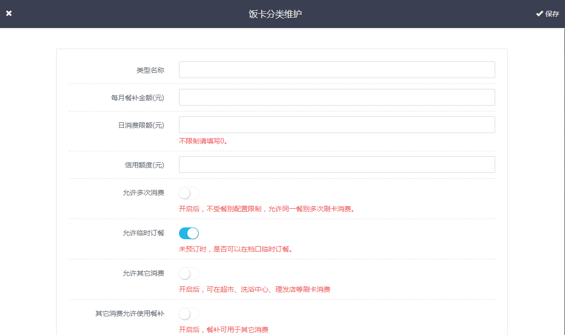 一般企业食堂饭卡金额分“充值金额”和“补贴金额”。如企业内部有餐费补贴,工作人员利用企业食堂管理软件可以实现批量无卡发放餐补,包括自动生成餐补和表格批量导入两种发放形式。餐补支持额度餐补和现金餐补,实现分类统计。在固定时间以自动充值批量打入员工账户,员工在消费时,食堂可以设置比例消费,即每次消费金额包含个人充值金额与餐补额两部分,两部分的比例在系统后台进行设置,比例可以调整,自定义补贴额度上限。当补贴金额不足时,消费时则会使用员工自己充值的金额。