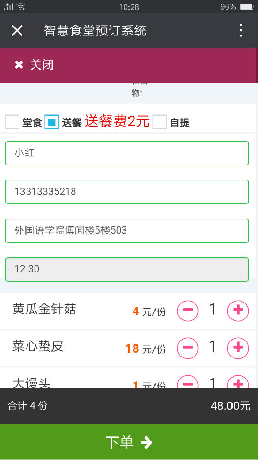 学生可以在食堂微信平台相应的时间段内选择自己所喜欢的饭菜进行订餐,可以选择自提或者派送功能。与此同时,食堂可以根据当前的订餐信息统计进行备餐,备好餐后把餐品放入智能取餐柜,餐柜可以摆放在固定区域。餐柜具有保温/保鲜功能。在保证食材不变质的安全温度范围内既能保障饭食的温度,又能保持其口味。独立的小餐柜将每位用餐者的饭菜分开存放,既安全又卫生。使用高校食堂管理系统不仅能订餐还能指定时间送,比以前节省了不少时间,为学生提供了便利。微信订餐既符合学生们的需求又与时俱进,也给经常宅在宿舍的同学开启了一大福利。外卖功能可以在高校食堂管理系统后台设置开启或者关闭,如果食堂关闭,懒到不出门的宅男宅女,只能靠舍友拯救啦。