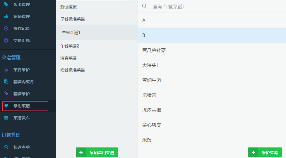 满客宝智慧食堂管理系统支持管理员编辑菜谱,一次可以发布多天的菜谱,没有上限。同时支持菜谱复制,方便食堂管理员操作。系统可以预设常用菜谱,制作菜谱时,可以直接选择常用菜谱即可,快速方便。菜谱还可以设置套餐模式,套餐里可以设置多个分类,每个分类下面可添加多个菜品,应可设置每个分类的菜品数量和用户可选的数量。