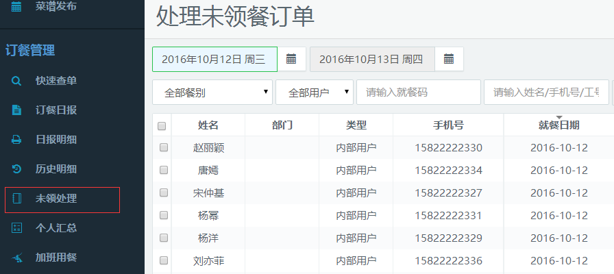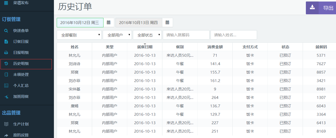 食堂操作员在后台和档口售饭机上均能查看到所在食堂当日预订情况(预定人数、未领餐人数等),自动生成订餐报表,并支持导出。系统应可以按单位、部门、个人在以往任意时间段内(精确到日)查询消费记录,其中包括姓名、单位、消费地点、消费金额、消费明细、消费时间。