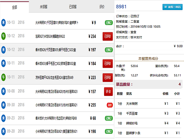 就餐者订餐完成后,能够在满客宝智慧食堂管理系统页面(网页、手机APP、微信公众号)快速查看历史预订信息,包括订餐日期、菜品名称、订餐价格、是否已经消费完毕等就餐者预订后应可以在规定时间内退订,由自己和管理员协助操作皆可,方便操作、轻松退款。就餐者用餐后可以对菜品、服务质量、就餐环境进行打分,食堂有依据的改进,有效提升食堂服务水平。