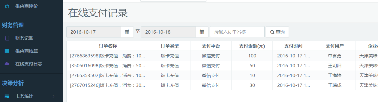 在线支付日志帮助财务管理人员统计饭卡在线充值的金额、充值方式、充值日期、支付用户等信息,详细记录每笔交易。