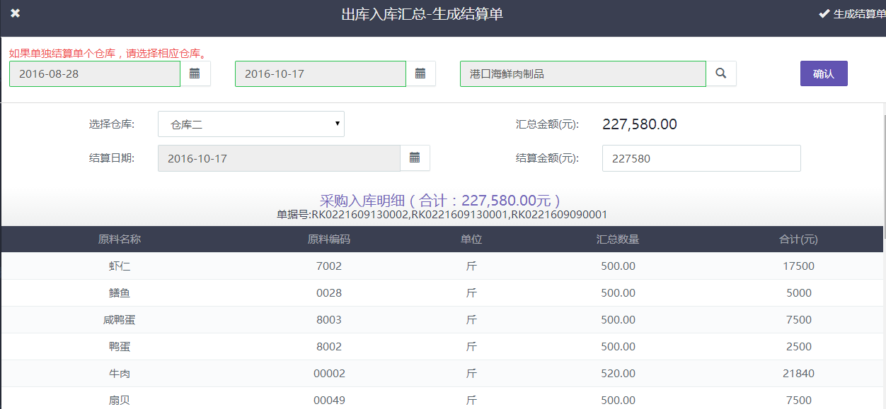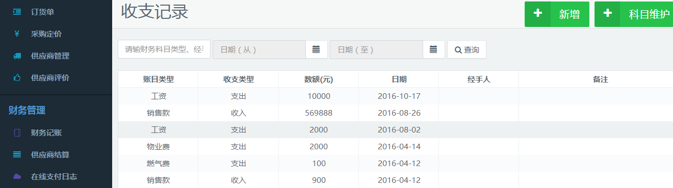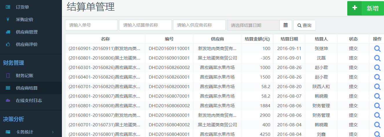系统可以选择供应商结算周期,财务人员在系统中选择相应的时间段和供应商,进行收支统计。通过系统还可以看到出库、入库的明细信息,方便财务人员进行凭证核对,避免人工操作造成的财务工作失误以及财务漏洞。