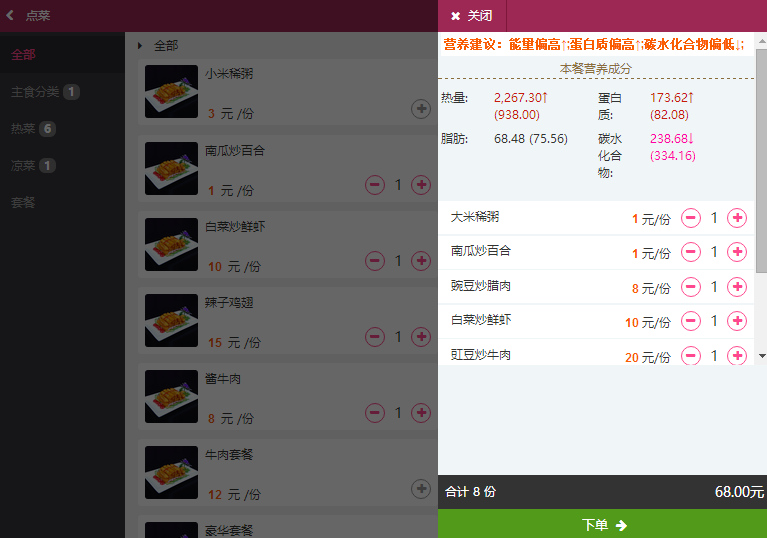 系统自动分配合理的营养量到每一餐,用餐人员订餐时可以作为参考,营养量超出或低于标准营养量,系统都会做提示,保证就餐者合理、健康的饮食,并且医院特殊病患订餐时,系统自动限制选择不可以食用的菜品。