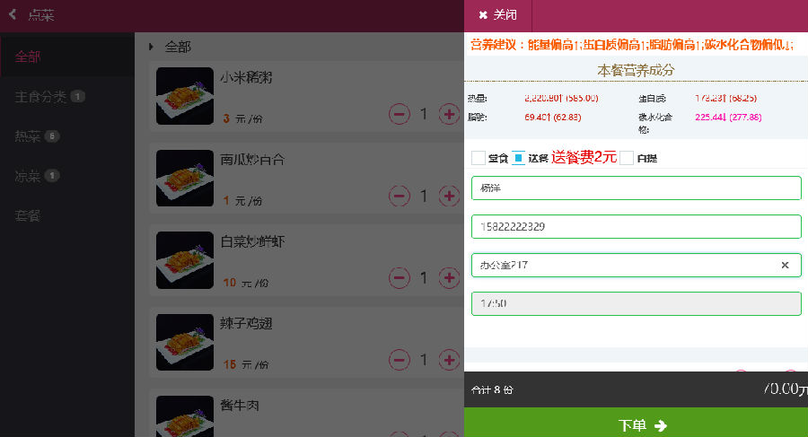 食堂在线订餐系统支持手机app、微信、网页等形式的订餐,就餐者提前进行预订爱吃的菜品。为方便不同人群的就餐需要,满客宝智慧食堂管理系统不仅支持堂食就餐模式,还支持自提或派送。