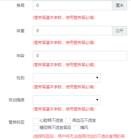 系统提供全面的原料营养信息库,并自动对原料营养进行科学的计算后,针对不同类型的营养诉求进行合理的搭配,供用餐人选择。系统可根据用餐人的身高、体重、年龄、营养诉求等基本信息自动匹配营养套餐。