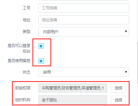 用户信息的维护,还可以设置是企业内部用户还是外部用户,例如如果是外部用户在食堂就餐价格就会和内部用户有所不同。在下面是设置用户是否可以登录后台,一般只有食堂员工配置这个功能。是否使用餐柜按钮,可以对员工是否使用餐柜进行配置。开启后员工在手机app、微信端预定后,到了就餐时间就可以去餐柜进行取餐,避免拥挤排队。