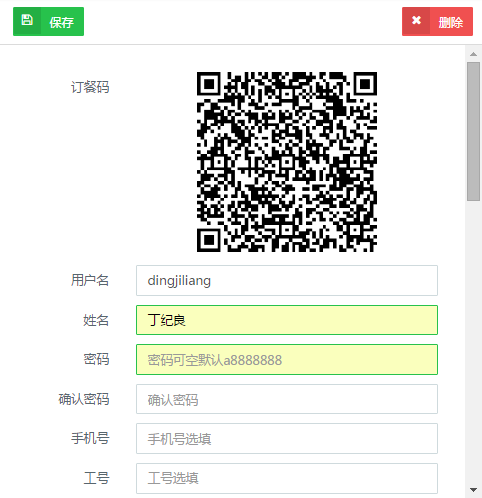 每个员工饭卡信息中有独有的一个二维码。上面记录着饭卡用户的地址信息等,主要应用于医院食堂场景中。然后维护用户名、姓名、密码、手机号等信息。