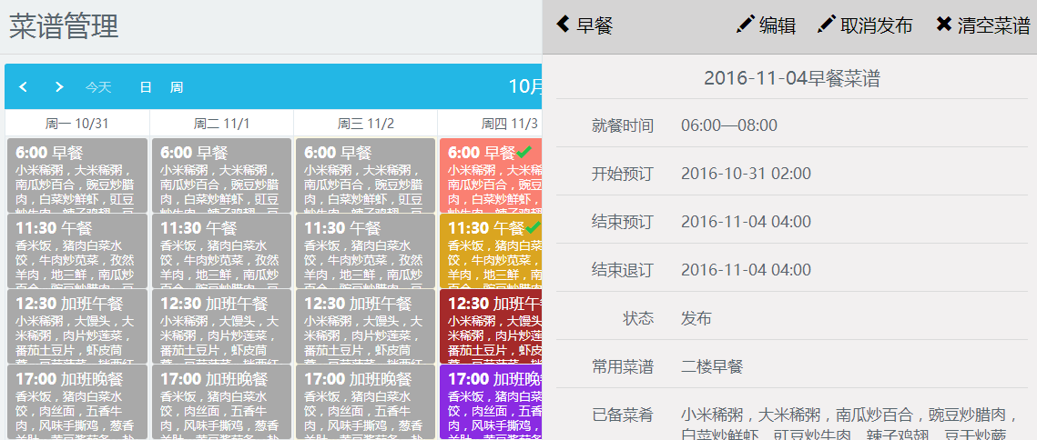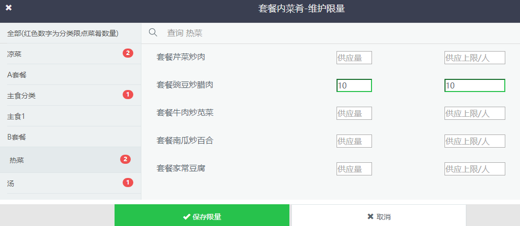 在食堂管理系统的菜谱管理中,选择好对应的餐别,进入编辑,选择好限量供应的套餐,在套餐内选择对应的菜品进行供应数量的编辑。