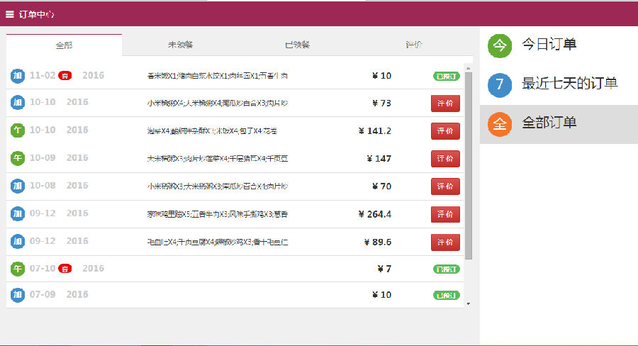 还可以查询就餐者的订餐,包括今日订餐、最近七天订餐及全部订单,还可以点击评价,进行饭菜的口味、食堂服务等信息的评价,食堂根据就餐者评价对菜品及服务进行改进。