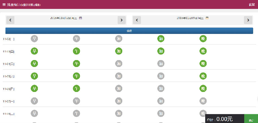 智慧食堂管理系统网页预订端可以进行批量预订,就餐者可以根据食堂发布的菜谱,选择要预订的时间,进行餐别的预订。