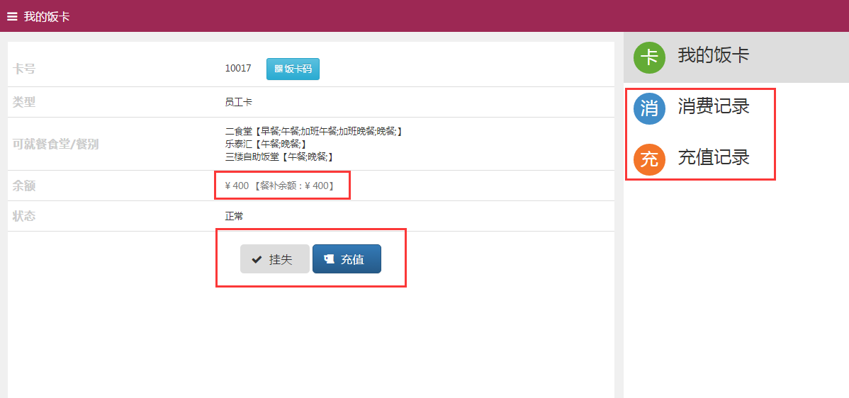 还有最后一个,也是对于就餐者来说最方便快捷的功能了,那就是在线充值饭卡、在线挂失,可以通过微信、支付宝进行在线饭卡充值,无需再到专门的窗口去充值了,挂失也是一样的,饭卡丢失了,可以第一时间进行挂失,减少经济损失。