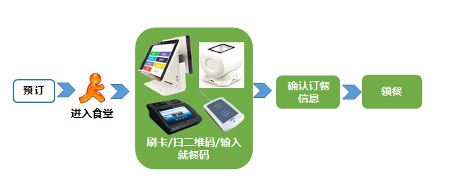 就餐者通过满客可以实现的订餐方式订餐后,可以携饭卡、就餐码、订餐二维码到预装好满客宝智慧食堂管理系统的智能售饭终端、智能取餐柜、食堂窗口的刷卡器处去刷卡或输入就餐码或扫描订餐二维码进行领餐,取代传统食堂的纸币、纸卡、饭菜票等领餐方式,使食堂实现了初步的自动化管理,让就餐者领餐更加方便。