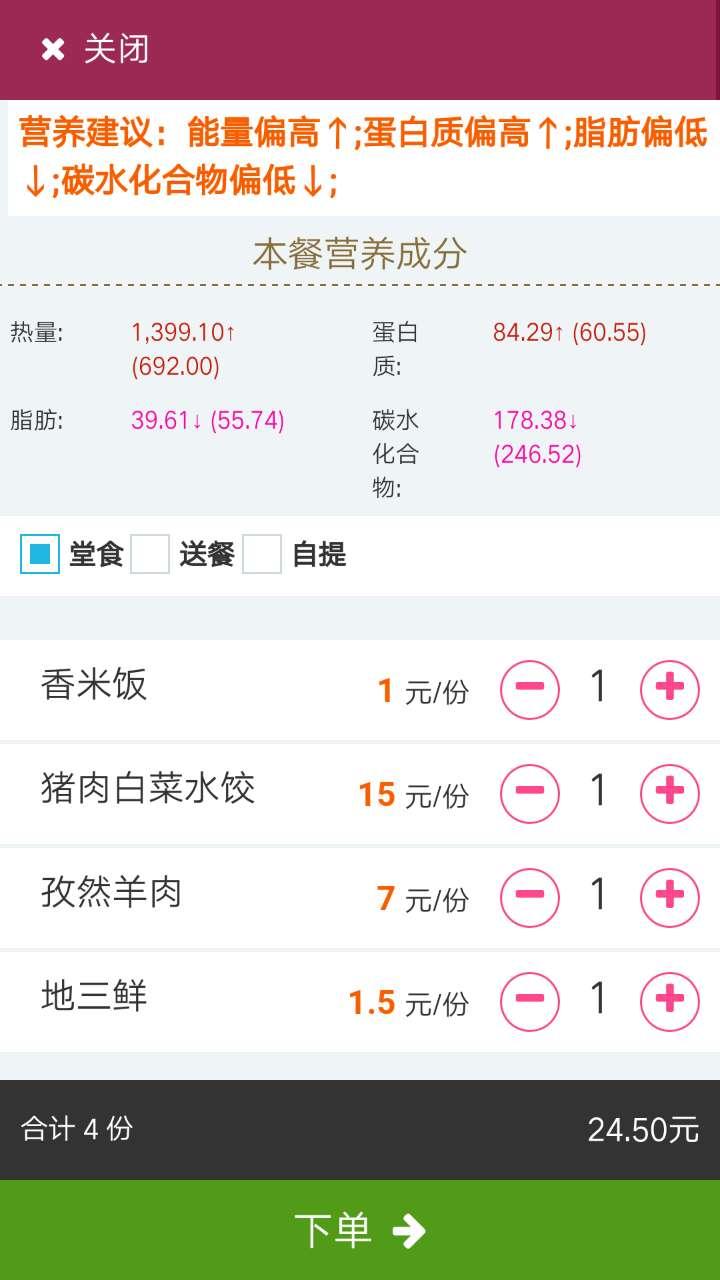 哪个方面需要重点补充,哪个方面适当的补充,是否有忌口等,为患者提供符合具体情况的营养餐食谱。乐订餐app还可计算出患者的一天内营养素推荐摄入量,自动计算营养素的摄入量,井且提供各种菜谱对各种营养素的比例,为营养配餐提供科学的依据。