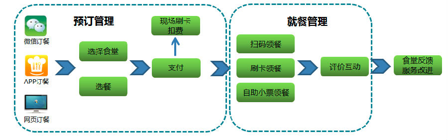 就餐人员运用食堂管理系实现手机app订餐、微信订餐等多种在线订餐方式,选择自己喜欢的菜品,并进行在线支付,用餐后还可以进行评价。所有流程更便捷、更智能化,为单位职工创造优质的就餐体验。