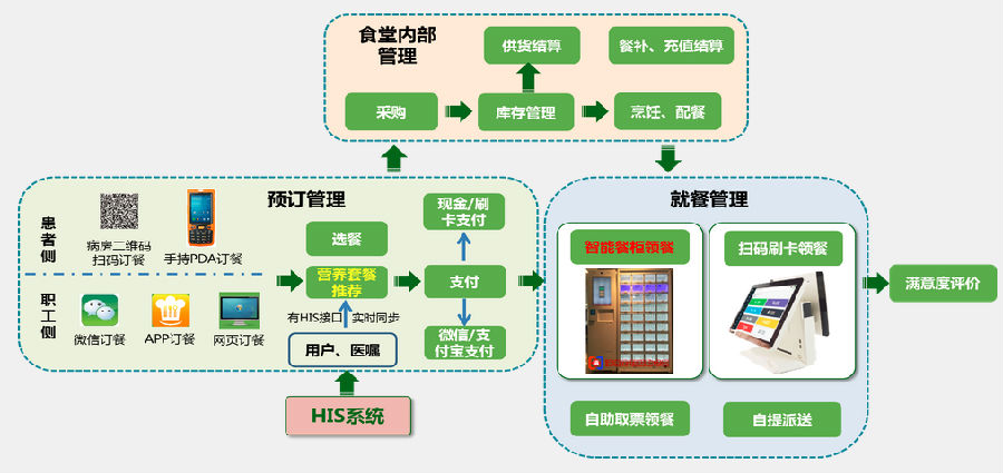 医院传统的订餐方式是医院工作人员,挨个去病房询问患者订什么饭菜,进行记录统计,工作繁琐效率低。随着科技的发展,食堂管理系统的出现让就餐者就餐更便捷。系统支持手持移动订餐机订餐,医护人员按科室携带手持订餐机,扫描患者床头二维码,后即可根据患者要求订餐,选择菜品,同时手持订餐机可支持小票打印、刷卡消费功能,杜绝现金交易中的漏洞,避免交叉感染,既方便患者又提高医院食堂就餐率。就餐者也可以用自己的手机扫描床头二维码等方式进行自助订餐。