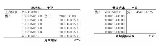 某餐厅7月底盘存时有20斤土豆,8月一共进了5次土豆,每次100斤,最近一次是8月29日,8月31日盘点时剩余45斤,每斤成本15元,财务上应如何处理?