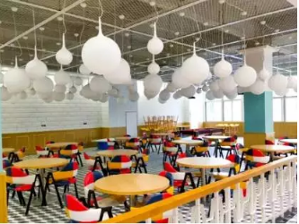 海军红蓝白三色椅子、俏皮的小圆桌配上明亮的水滴形满月灯,给食堂增添了几分活力,有一种小天堂的既视感,仿佛置身于度假。暖白的吊灯映照下来,明亮而温暖!
