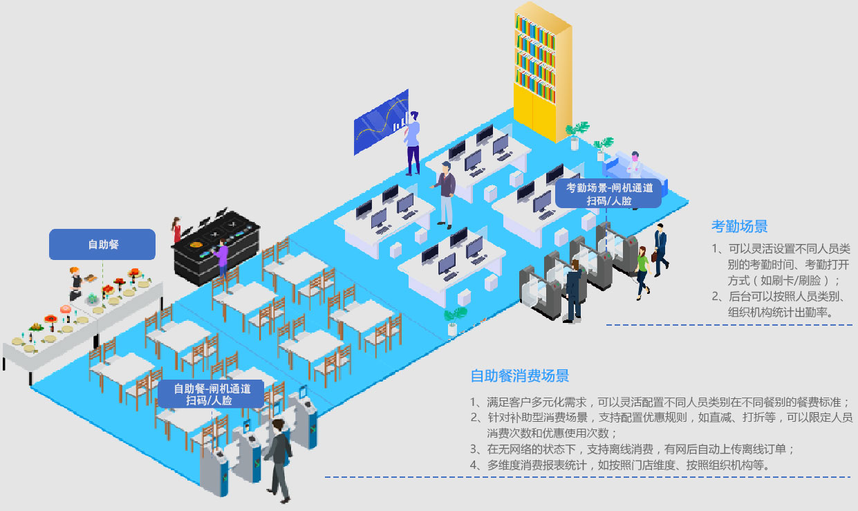 自助餐消费场景满足客户多元化需求,可灵活配置不同人员在不同餐别的餐费标准、设置优惠规则、限定人员消费次数和优惠使用次数、支持离线消费、多维度统计消费报表。