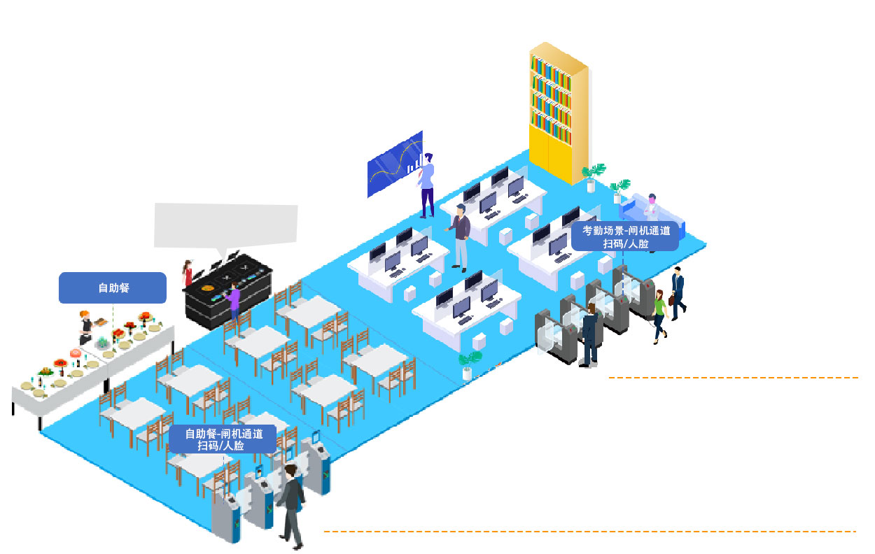 满客宝人脸闸机采用红外活体人脸检测技术,广泛适用于政企单位、高校、中小学、医院等业态,主要用于食堂自助餐消费,工地工厂、酒店、写字楼、景区进出入门禁管理、考勤管理等多场景。