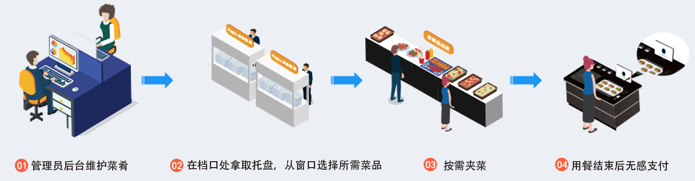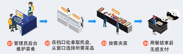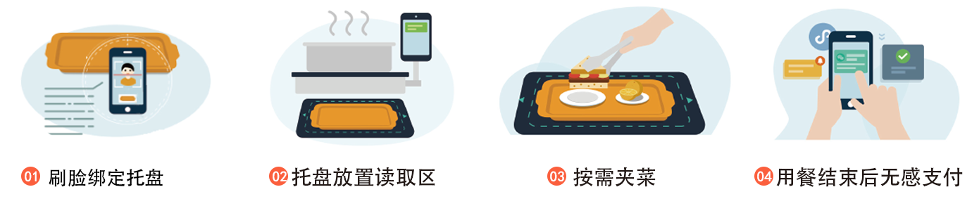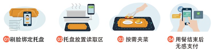 食堂将制作好的菜品,盛放到带有芯片的餐具中,通过定价终端扫描定价后放入选餐区,就餐者可以自由选取菜品放入托盘内,结算台将自动识别菜品信息、营养成分及价格,并自动核算出整单价格,就餐者直接通过刷脸/扫码/刷卡的方式完成支付。