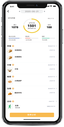 就餐者在选餐时可以直接查看所取菜品的营养成分及摄取量,在用餐结束后还可以随时通过移动端查询营养分析报告。